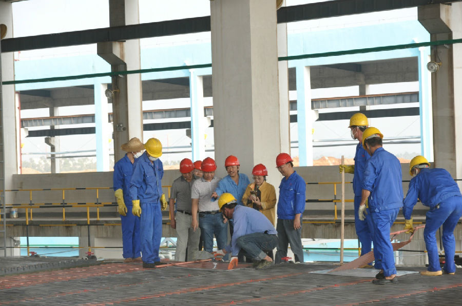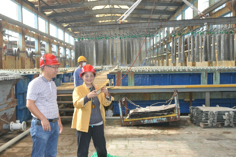 在精煉三車間,趙總從一樓走到二樓,邊走邊看,任總詳細(xì)向趙總匯報(bào)了精煉三車間的生產(chǎn)情況,生產(chǎn)工藝。精煉三車間是2014年新建的車間,2015年11月投產(chǎn),主要生產(chǎn)電積銅。趙總聽了任總的介紹,不停地點(diǎn)頭稱贊。在二樓,趙總停下來,認(rèn)真觀看工人對產(chǎn)出的銅板進(jìn)行外觀校正,看到光亮如鏡,四周整齊的銅板,連聲稱贊廣西銀億的制銅工藝確實(shí)先進(jìn),非常高興,不由自主的拿出智能手機(jī),拍下了車間工人勞動的情景。