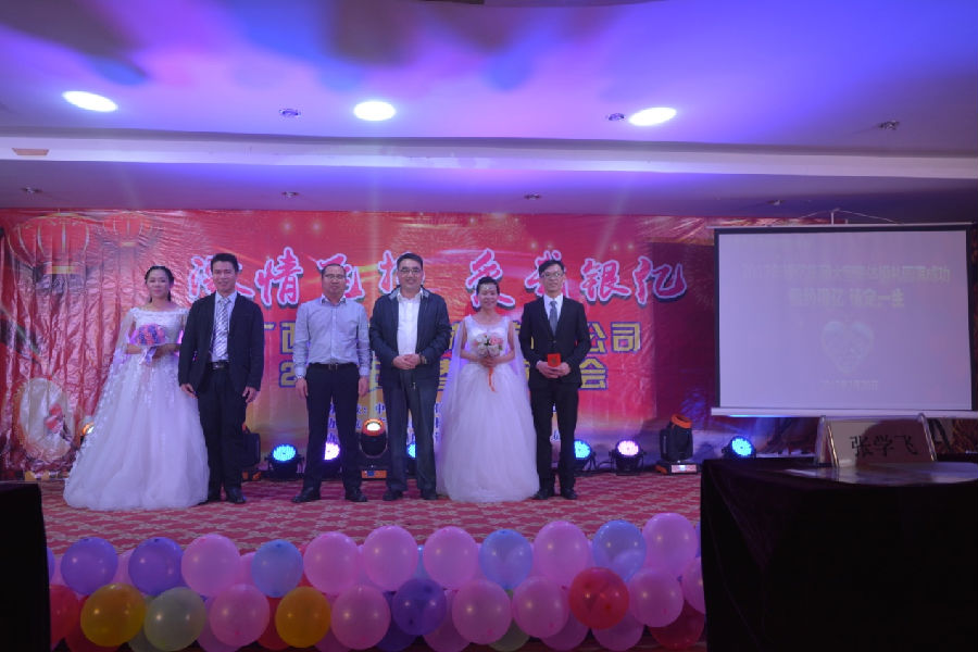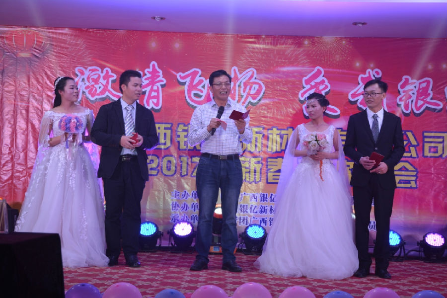 晚會中段安排了集體婚禮,給2對新人舉辦婚禮,將晚會歡樂的氣氛推向了高潮。新郎楊家樹和新娘吳秋麗;新郎藍(lán)偉東和新娘潘桂嬌,都是大學(xué)本科畢業(yè),學(xué)的是化學(xué)專業(yè),入職公司,工作勤勉,奮發(fā)向上,他們把心放在了工作上,把家安在了公司,把夢想放在了銀億事業(yè)上,產(chǎn)生了神奇的“化學(xué)反應(yīng)”,他們比翼齊飛,喜結(jié)連理,是眾望所歸,佳偶天成。廣西銀億公司工會主席章群宏作為證婚人,發(fā)表了熱情洋溢的證婚詞:“在今天大喜的日子里,我謹(jǐn)代表公司工會,向兩對新人表示熱烈地祝賀和美好地祝愿。衷心祝愿他們相濡以沫,白頭偕老,甜甜蜜蜜,幸福永遠(yuǎn),早生貴子!”章主席查看了兩對新人的《結(jié)婚證》,幽默地大聲說:“我宣布:新郎楊家樹和新娘吳秋麗;新郎藍(lán)偉東和新娘潘桂嬌,婚姻合法有效,即日起,持證上崗,掛牌營業(yè)!”全聲歡聲雷動,掌聲四起,經(jīng)久不息。這場集體婚禮,表達(dá)了員工“愛我銀億”的心聲――銀億凝聚人心,事業(yè)興旺發(fā)達(dá)!