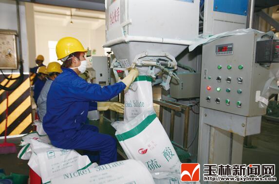 工人在對(duì)硫酸鎳產(chǎn)品進(jìn)行裝包。