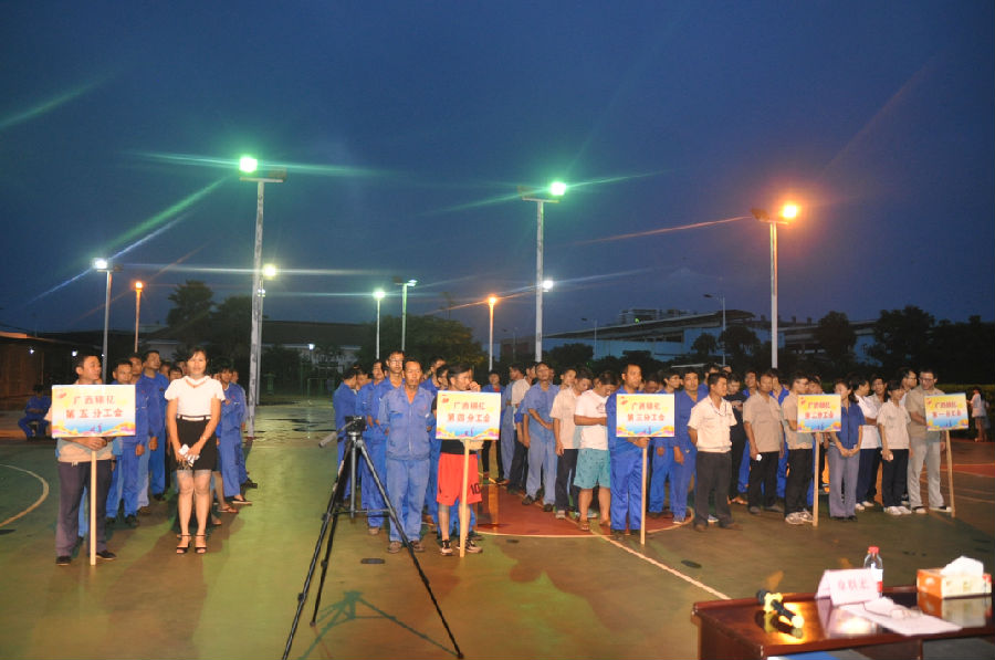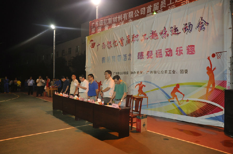 2017年9月22日晚,廣西銀億首屆職工趣味運(yùn)動(dòng)會(huì)勝利閉幕。晚7:00,閉幕式在廣西銀億燈光球場(chǎng)舉行,廣西銀億常務(wù)副總經(jīng)理張學(xué)飛、副總經(jīng)理任衛(wèi)東、副總經(jīng)理陳為清、副總經(jīng)理朱紅斌、集團(tuán)新材料事業(yè)部副總王海、工會(huì)主席章群宏參加。參賽運(yùn)動(dòng)員在分工會(huì)的牌子引領(lǐng)下,成十列縱隊(duì)入場(chǎng),五個(gè)分工會(huì)的參賽運(yùn)動(dòng)員依次并排列隊(duì),整齊站在球場(chǎng)。