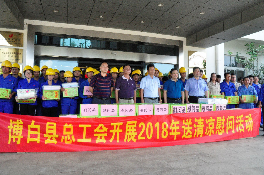 為進(jìn)一步關(guān)心基層員工的身心健康,傳遞縣工會對員工的關(guān)愛,營造良好和諧的工作氛圍。8月20日,博白縣工會主席周鵬昌、工會黨組書記高舉紅、龍?zhí)懂a(chǎn)業(yè)園工會主席張小輝等領(lǐng)導(dǎo)聯(lián)合對我司開展慰問“送清涼”活動,為我司奮斗在一線的員工帶來150箱清涼飲料和300條毛巾。銀億公司工會主席章群宏接待了工會領(lǐng)導(dǎo),并表示此次縣總工會送清涼慰問活動不僅給一線干部員工送去了清涼,而且極大鼓舞了員工士氣,讓公司干部員工感受到了各級工會的關(guān)懷,激發(fā)了全司員工的工作熱情。