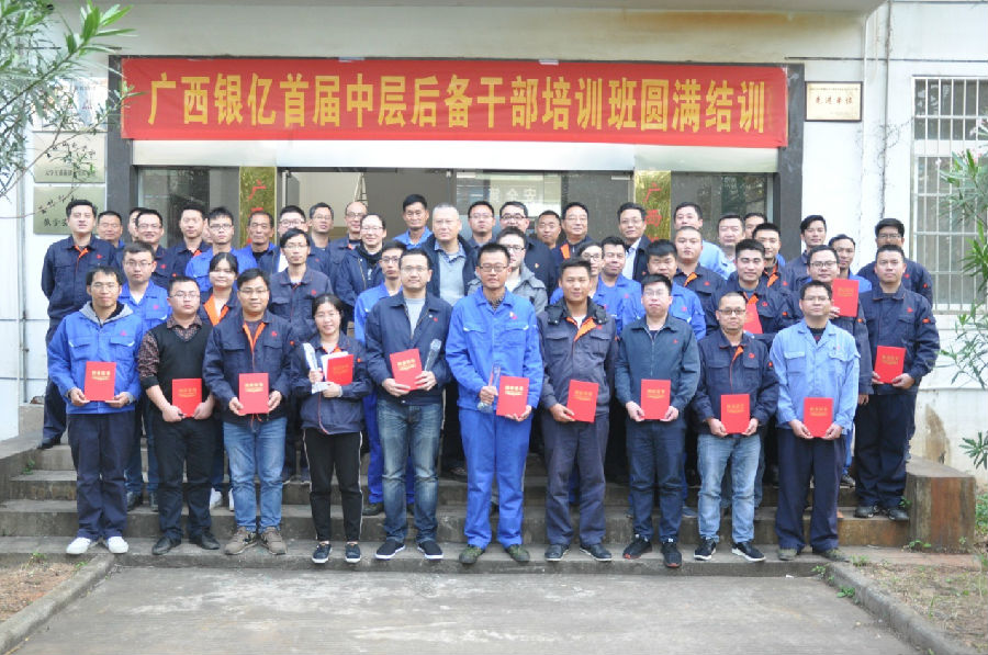 2019年1月21日廣西銀億新材料有限公司首屆中層后備干部培訓(xùn)班結(jié)訓(xùn)典禮在廣西銀億職教中心舉行,為期10個月的培訓(xùn)班圓滿結(jié)束。廣西銀億總經(jīng)理張學(xué)飛,副總經(jīng)理陳為清,副總經(jīng)理楊瑋光,黨委副書記章群宏,副總工程師和潤秀,出席參加了此次典禮。