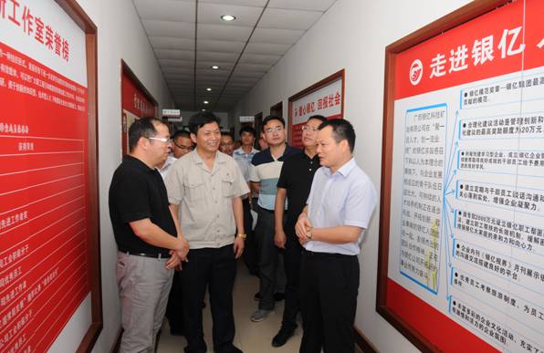 覃天衛(wèi)一行還參觀了以“科技銀億、人文銀億、慈善銀億、活力銀億、圓夢銀億”為主題的公司黨建文化長廊及公司多功能娛樂廳,黨建信息墻,黨員心愿墻等黨建文化陣地,對我公司組織黨員員工積極開展臺球比賽,組建銅管樂隊(duì)等豐富黨員員工生活形式多樣的文娛活動表示高度認(rèn)同。