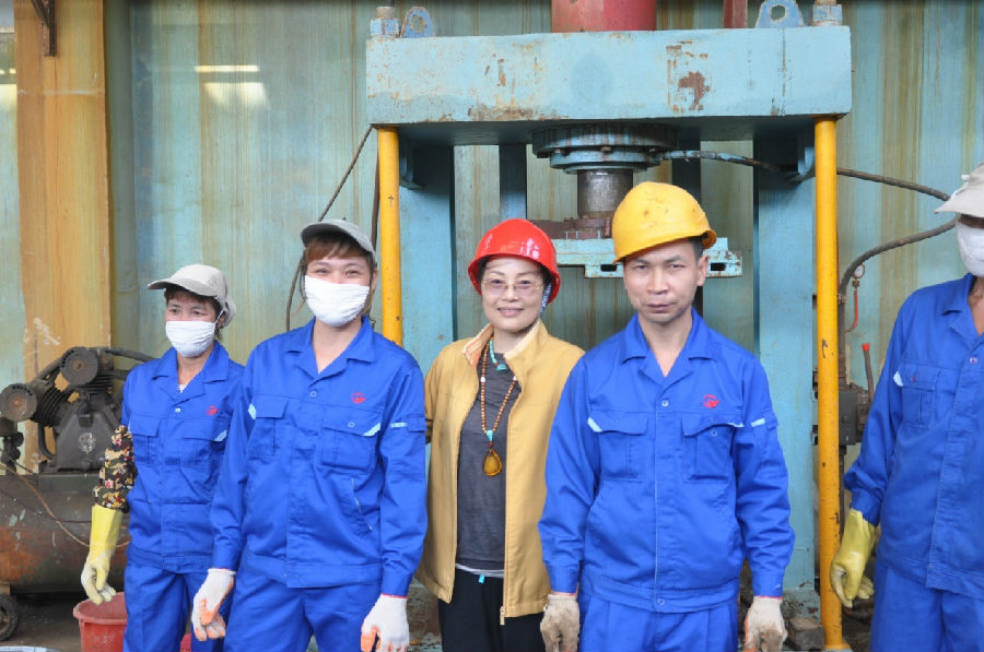 來到精煉一車間,桁吊從空中平移過來一排成形的鎳板,場面恢宏,鎳板剛一觸地,工人們分工明確,一組工人熟練地快速抽掉銅棒,一組工人嫻熟地取下鎳板,除去鎳板頂部的綠色雜質(zhì),還有一組工人迅速把鎳板疊加整齊,送上打包機(jī)捆扎牢固。同時(shí),工人們打掃場地,收拾銅棒和鋼絲繩,行動迅速,忙而不亂,有條不紊。看到這情景,趙總很感動,佩服工人勞動技能好,工作熱情高,應(yīng)工業(yè)的要求與工人合影留念,工人們高興地站在趙總兩邊,愉快合影。離開車間時(shí),趙總不停向工人們揮手致意。