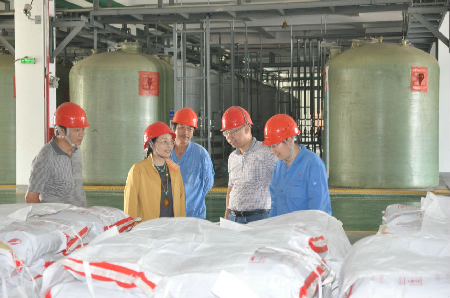 不一會,車到了鎳鹽車間。走進(jìn)高大寬敞整潔的鎳鹽車間,一進(jìn)門,趙總就看到了堆放整齊的氯化鈷產(chǎn)品,走到產(chǎn)品邊,興奮地用手摸著氯化鈷產(chǎn)品,連聲稱贊:“產(chǎn)品好!包裝也好!”巡視車間設(shè)備運(yùn)行情況,趙總感到十分驚奇,諾大的車間,生產(chǎn)線設(shè)備運(yùn)行平穩(wěn),噪音小,無灰塵,管控人員少,監(jiān)控室多個(gè)屏幕,準(zhǔn)確的反映了設(shè)備運(yùn)行情況。車間主任張磊認(rèn)真的向趙總匯報(bào)了鎳鹽車間生產(chǎn)情況,并說鎳鹽車間目前還沒有完全投產(chǎn),部分生產(chǎn)設(shè)備正在安裝中,如果全部投產(chǎn),產(chǎn)量將翻一番。趙總聽了非常滿意,在車間與公司任總、吳總助、章主任、車間張主任合影。