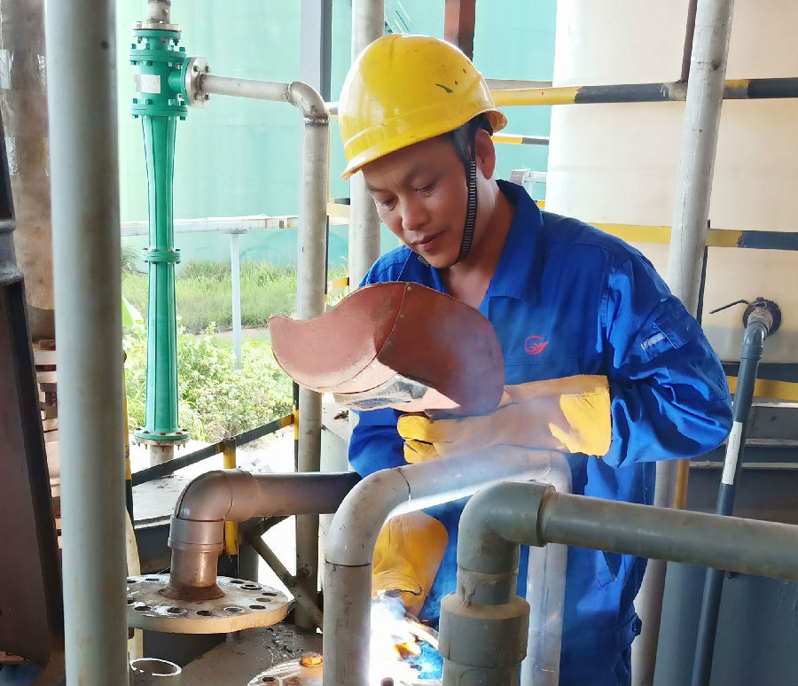 在制液工段維修螺旋輸送機(jī)時(shí),他要從壓濾機(jī)下料斗處匍匐爬入,料倉里狹窄惡臭、陰暗潮濕,鋒利的螺旋刀片時(shí)常割破衣服,直抵血肉。不過,這種工況對于他來說不過是家常便飯而已。
